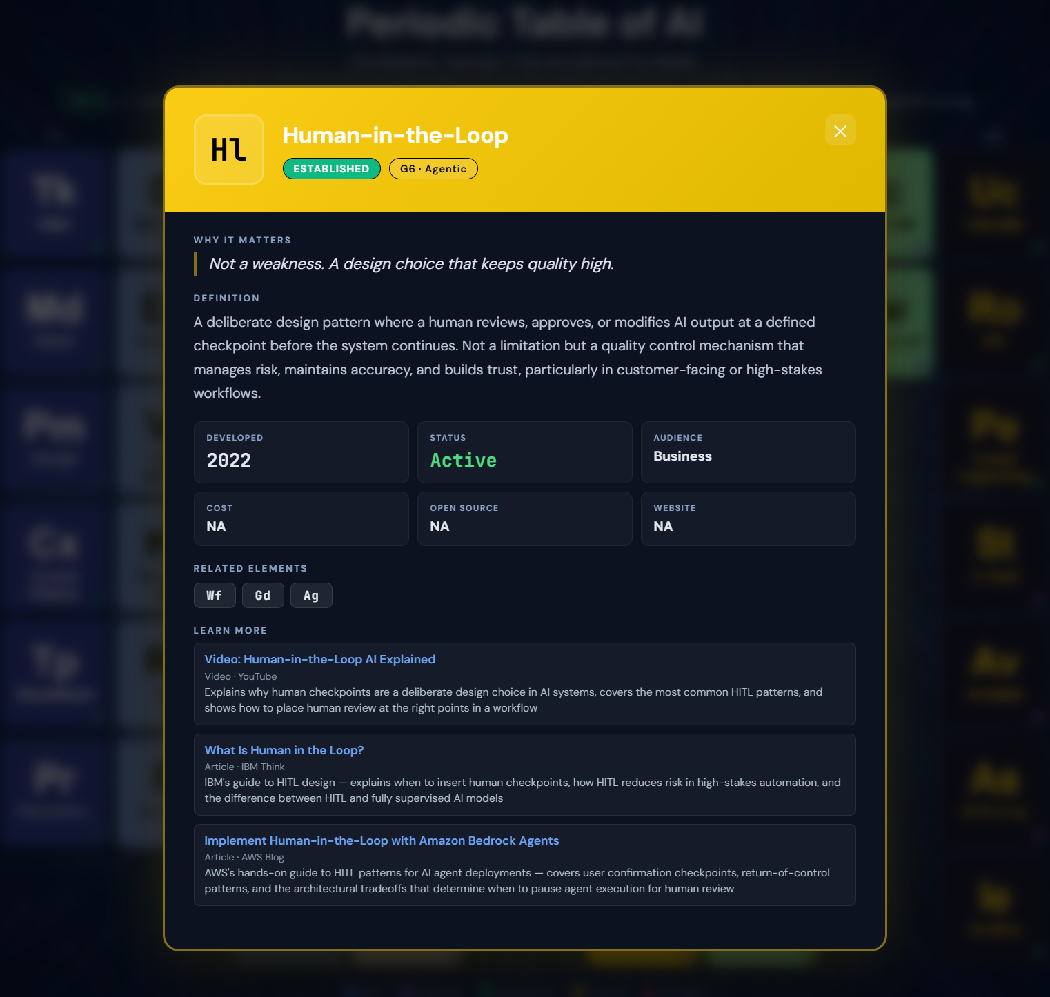 The Periodic Table of AI is a visual reference framework that maps the AI landscape into discrete, named concepts, organized the same way a chemist reads elements: structured, scannable, and designed to show how things relate to one another. It is updated regularly and it exists because the AI conversation moves faster than most organizations can absorb, and professionals who need to make decisions about it rarely have a clean starting point.